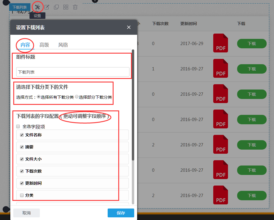 下载列表的字段配置:可根据需要勾选要显示的字段,系统字段有:文件名称、摘要、文件大小、下载次数、更新时间、分类、缩略图、复制下载链接。也可以勾选显示自定义的字段。