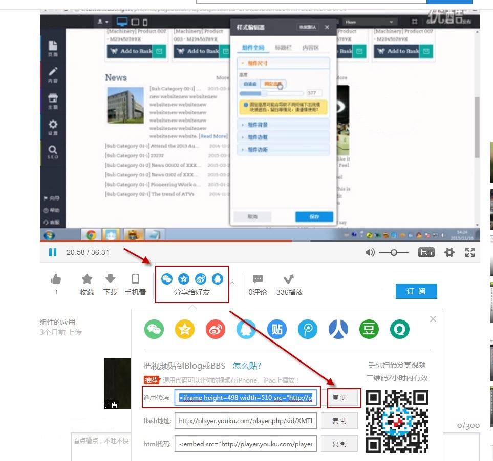 如何在后台上传关于某个产品分类的视频?即单击某个产品分类时,弹出的页面可以播放这个视频,操作如下:1、确保开启"显示产品分类描述"这个功能,这个操作通常都是在系统页面中的产品列表页面来操作,首先把这个页面切换为当前页面;2、找到产品列表组件,单击设置;3、单击高级,勾选显示产品分类描述,单击保存;4、单击内容--》产品管理;5、单击管理产品分类--》找到这个产品分类,单击后边的编辑按钮,如下图所示:6、在产品分类描述里,单击源码,把从第三方平台获取的视频源码添加到下图所示的位置,单击保存即可。从优酷获取的视频源码: